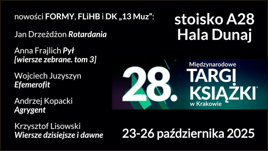 zapraszamy na stoisko A28 Hala Dunaj [Motyle Książkowe], gdzie podczas 28. Międzynarodowych Targów Książki w Krakowie [Kraków, ul. Galicyjska 9, Międzynarodowe Centrum Targowo-Kongresowe], zaprezentujemy nasze nowe publikacje [wydane razem z FLiHB oraz DK „13 Muz”]: